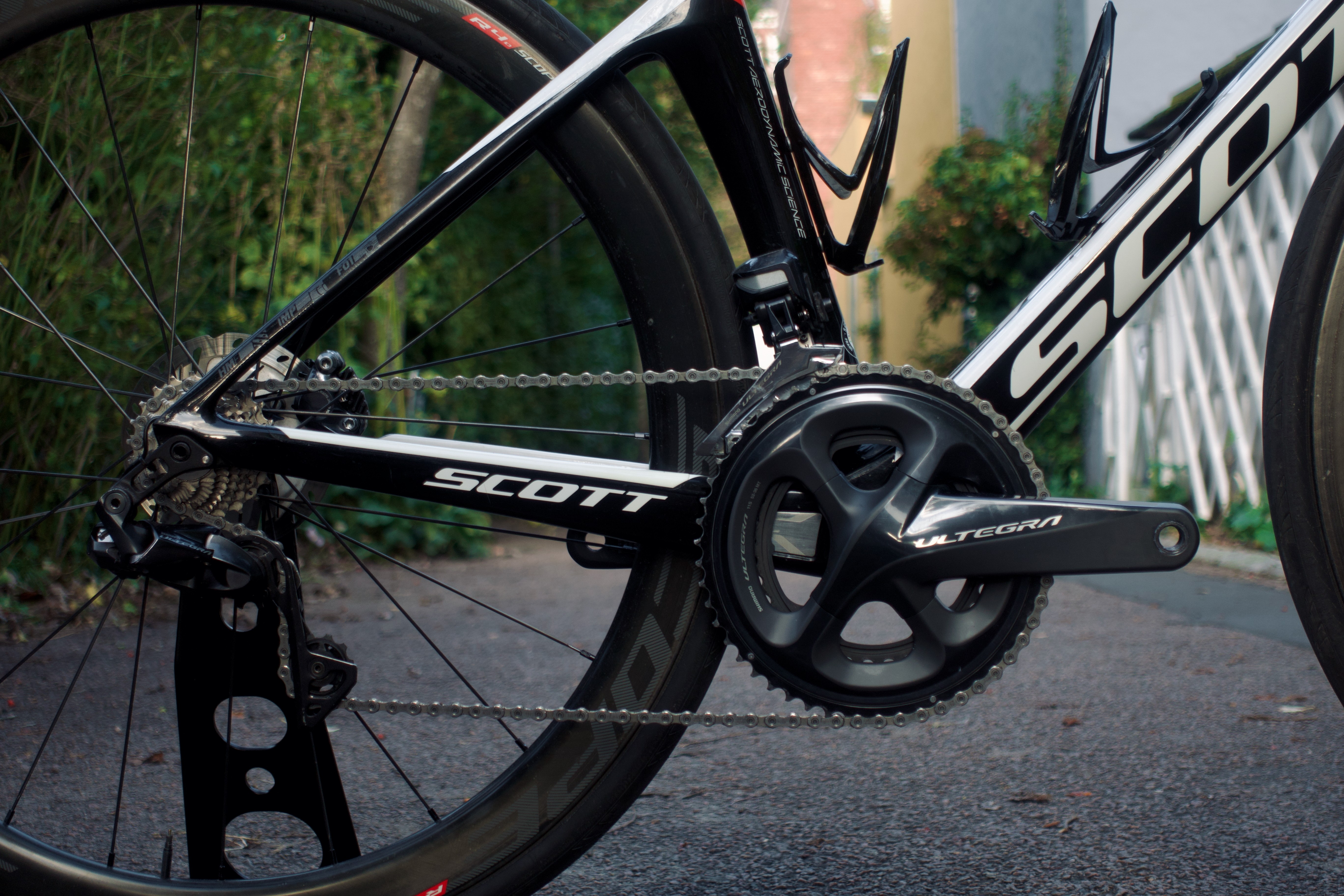 Scott Foil 10 Disc fra 2018 i størrelse 52. Scott Foilen er Scotts bud på den ultimative aero racer. Eksemplaret her er udstyret med den elektroniske Shimano Ultegra Di2 geargruppe med hydrauliske skivebremser. Gearingen er 52/36T foran og 11-23T bagpå.
